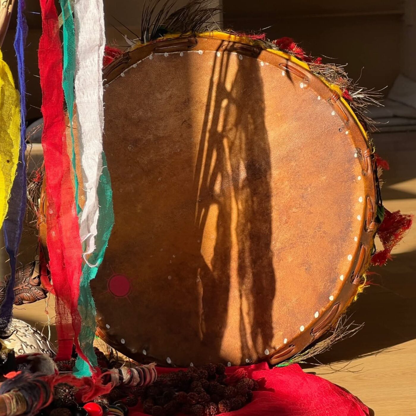 Die Trommel ist weit mehr als nur ein Instrument. Ihre zyklischen Rhythmen verbinden die physische und die spirituelle Welt und machen sie unverzichtbar für Heilung, Divination und Meditation. Ihre Konstruktion hat kosmologische Bedeutung: Die beiden Felle stehen für die männliche und weibliche Polarität, und der Schamane muss zwischen ihnen navigieren und sie in Einklang bringen. Der längliche Murro-Griff ist so geschnitzt, dass er einem Kila – einem rituellen Dolch – ähnelt, und ist mit drei Götterköpfen, Endlosknoten und Naga-Caduceus-Motiven verziert.